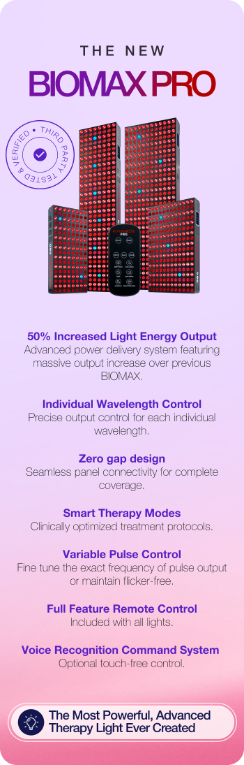 The BIOMAX PRO has five main upgrades: 50% more light energy emitted (shorter treatment times/higher power), "zero-gap" construction which eliminates the gap between multiple panels, individual wavelength control, adjustable pulse output control and the addition of Intelligent Smart Mode pre-sets. Same industry leading, medical-grade quality, just massively more powerful and precise. The BIOMAX PRO Is the most powerful and advanced human therapy light ever created with unique, revolutionary design.