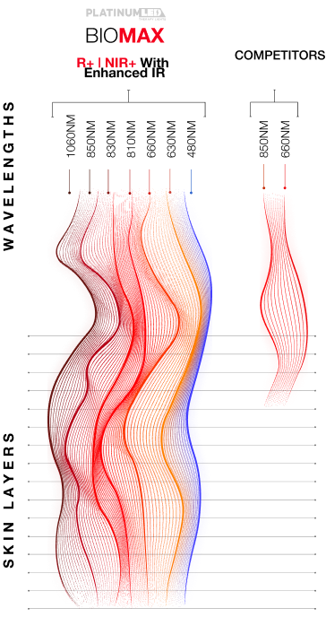 featuring the seven wavelengths of 480nm /630nm /660nm/ 810nm /830nm/850nm/1060nm. Please check out the following article for more information on our spectrum and the percentages of each wavelength: R+ |
